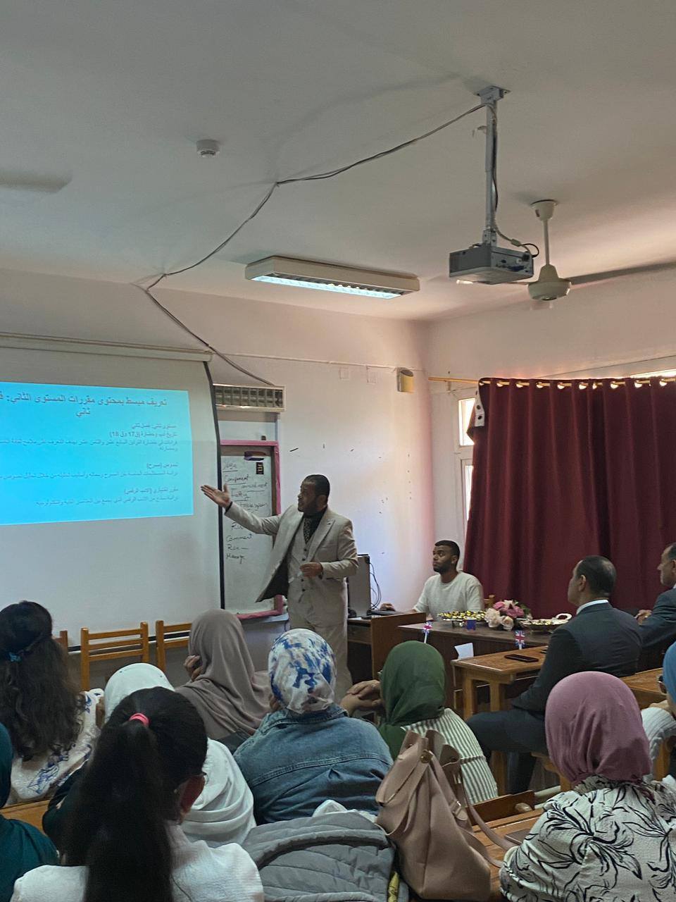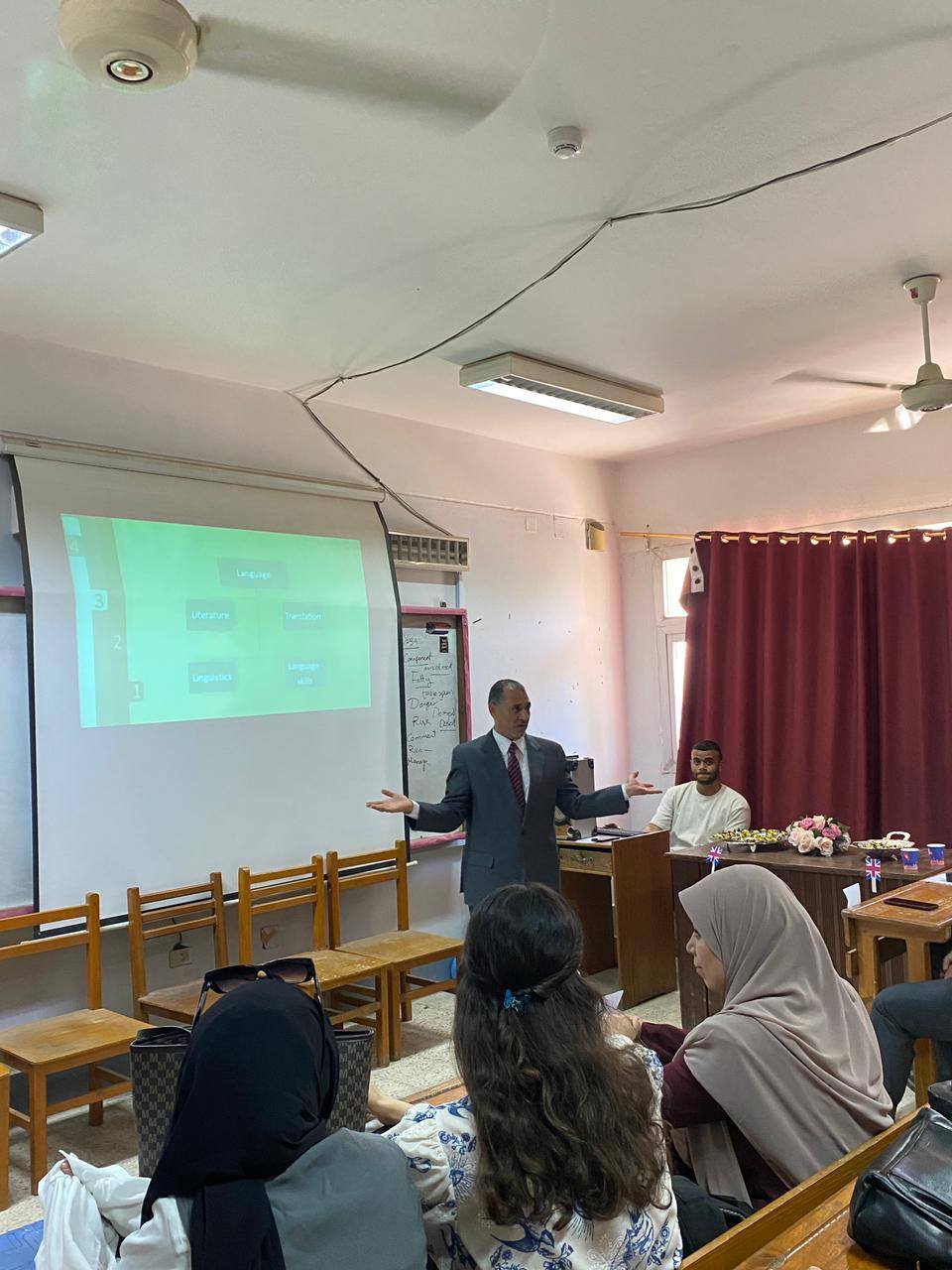 وقد استُهلّ اللقاء بكلمة ترحيبية ألقاها الأستاذ الدكتور/ ياسر خميس أمان، قدم خلالها عرضًا تعريفيًا حول مقررات الأدب ضمن لائحة الساعات المعتمدة، تبعه عرض من الأستاذ الدكتور/ عادل رفعت محفوظ حول مقررات اللغويات والترجمة، وقد تميز العرضان بثرائهما العلمي، كما شجعا الطلاب الجدد على التفوق منذ بداية مشوارهم الجامعي.