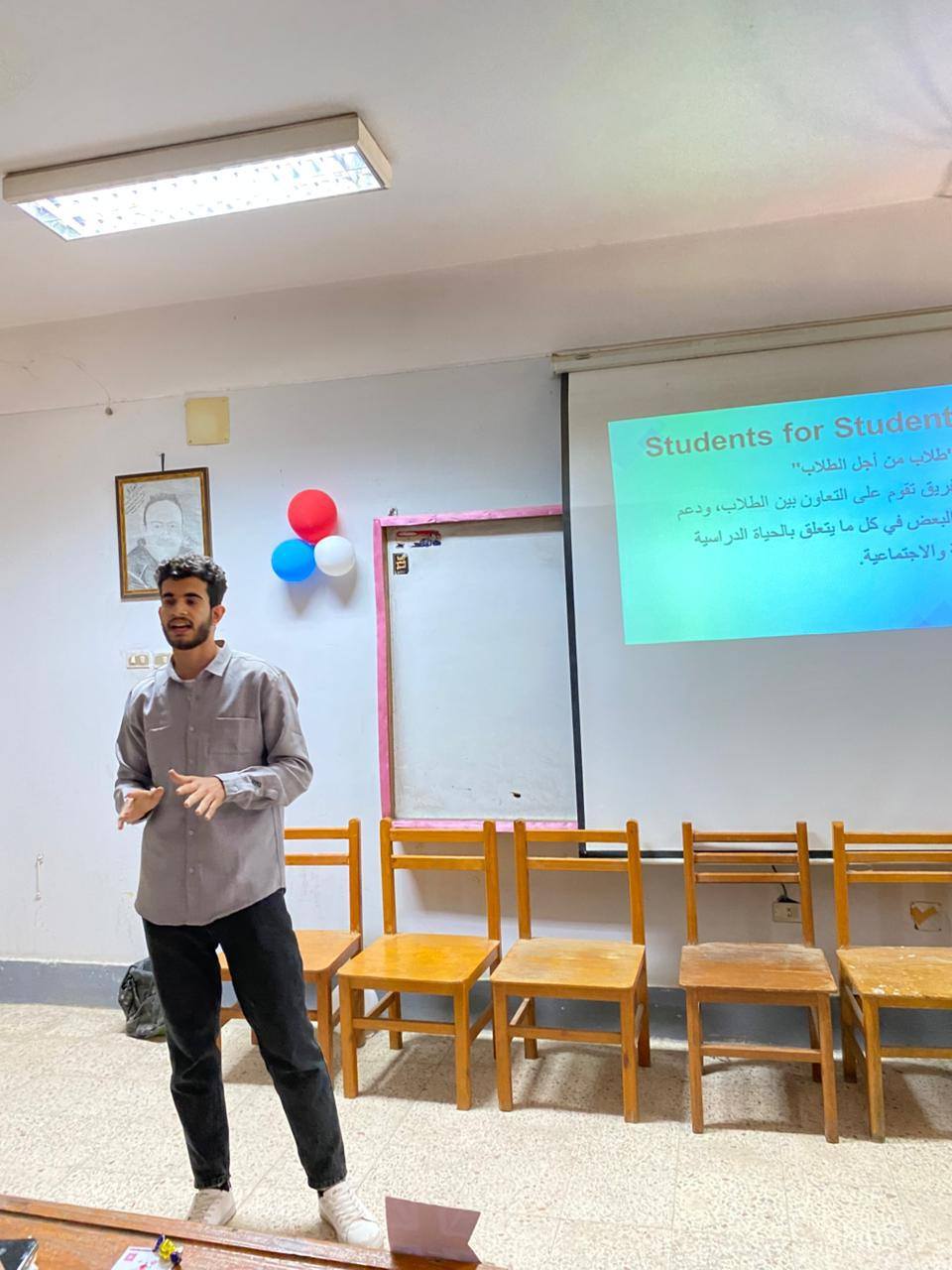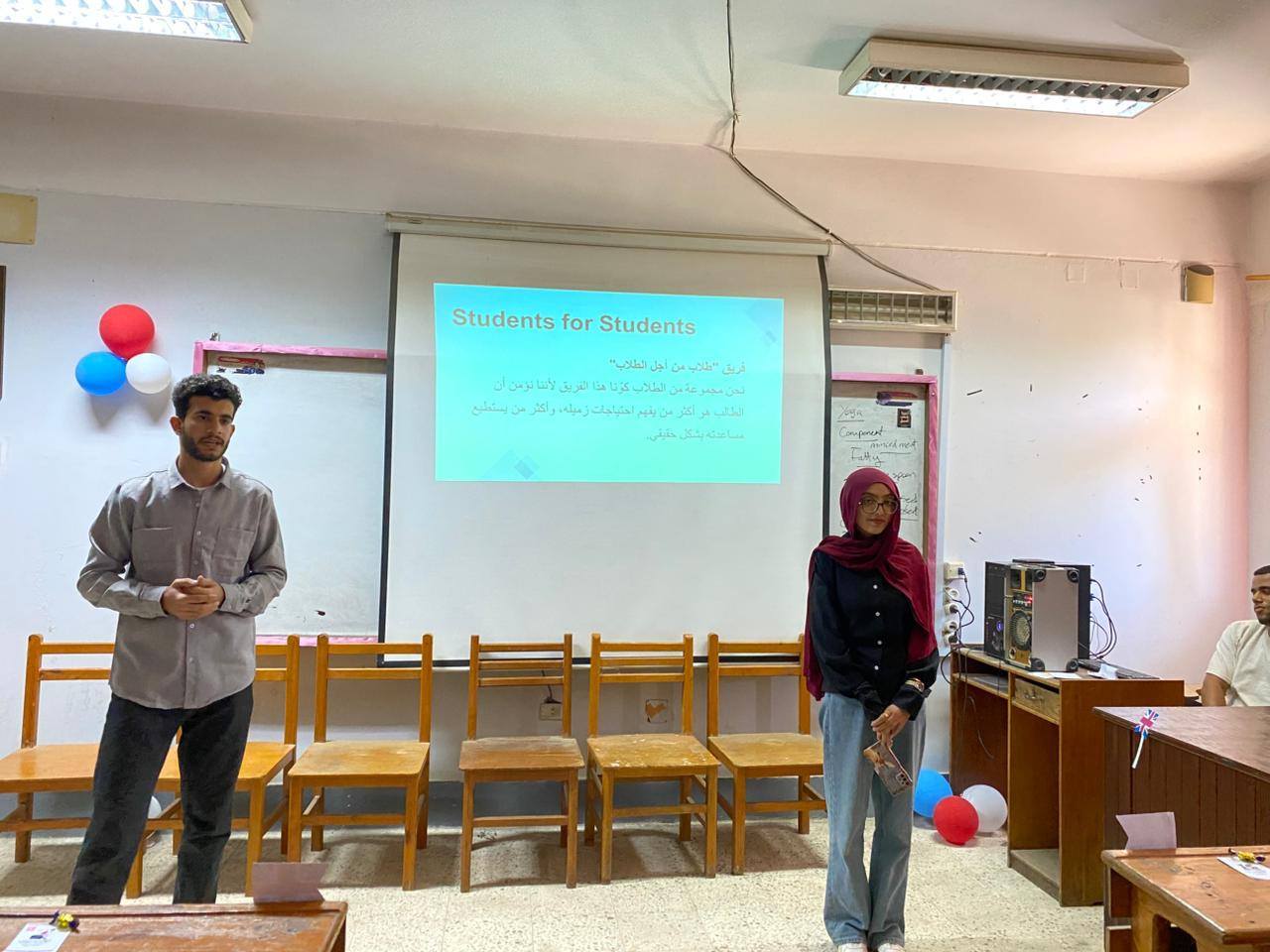 وفي ختام اليوم، قدّم طلاب الفرقتين الثالثة والرابعة تعريفًا بجماعة Students for Students، وهي مبادرة طلابية حديثة أُنشئت بريادة أ.د/ مروة الشريعي، وتنسيق أ.م.د/ سعودي صادق، وتهدف الجماعة لأن يوجه الطلاب القدامى زملاءهم الجدد التوجيه الصحيح فيما يخص السكن الطلابي والدعم الأكاديمي والاغتراب.