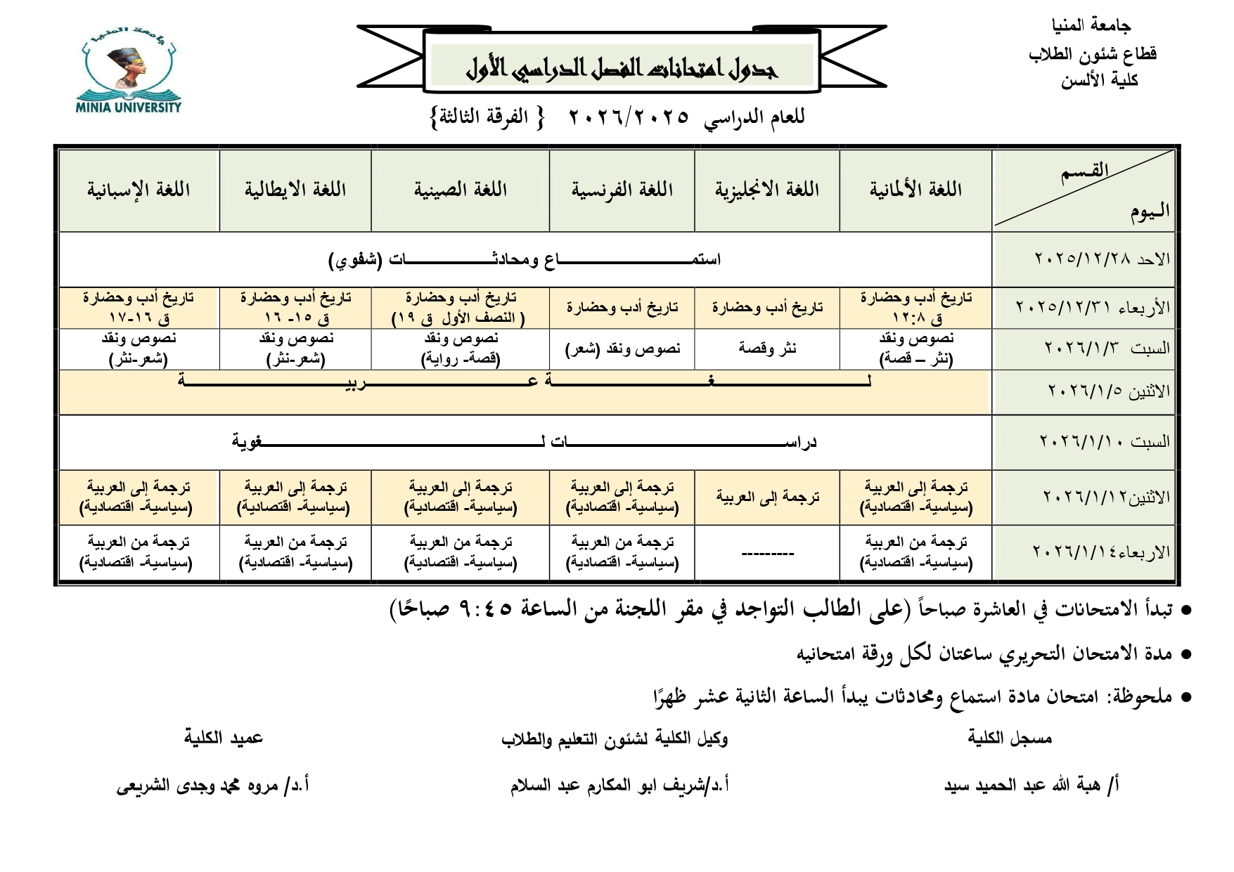 Faculté Al-Alsun, nous vous informons que le calendrier des examens de la